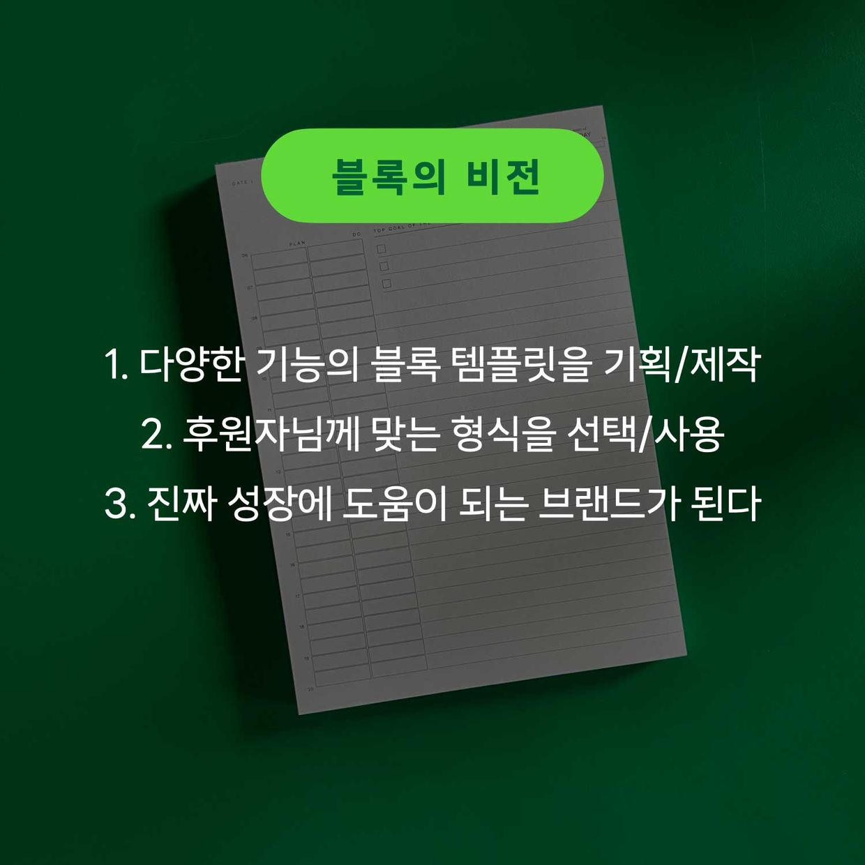 블록 플래너, 블록 타임라인, 블록 데케이드, 모닝로그, 문장수집.. 등등 다양한 목적을 가진 플래너/다이어리/노트를 만들어 왔습니다. 하지만 단순히 문구 제품을 만든다고 생각한 적은 없습니다. 블록 후원자님들의 성장에 진짜 도움이 되는 ‘진짜 자기계발 시스템’을 만든다고 생각하며 만들었습니다.