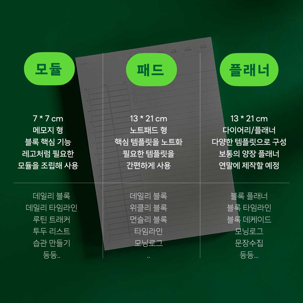 블록은 모듈, 패드, 플래너의 3Type으로 만들려고 하고 있습니다. 이중 당분간은 패드 형식에 집중해서 다양한 템플릿을 제공해 드리는 것을 목표로 하고 있습니다.