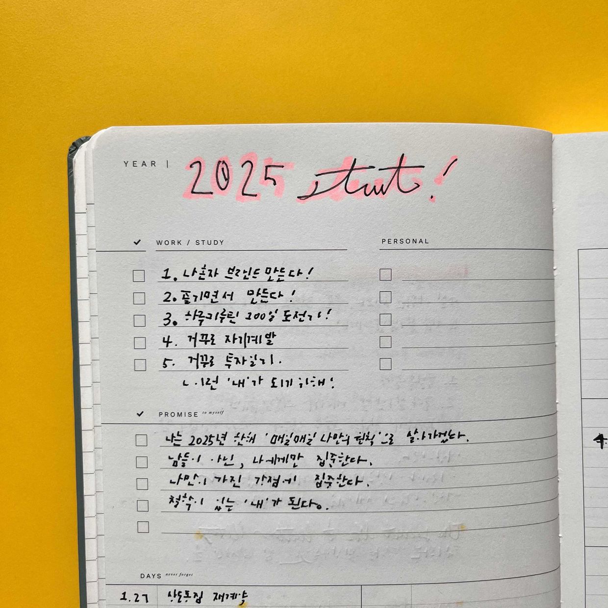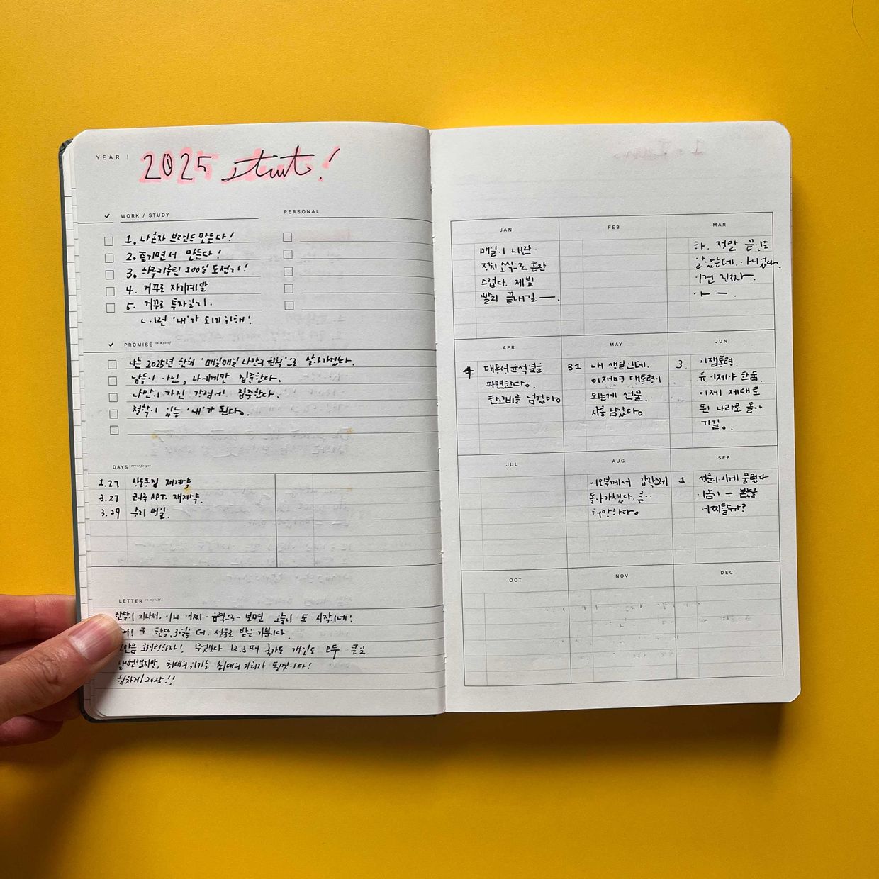 내가 이룰 핵심 목표와 다짐, 주요 일정/계획을 정리합니다. 마지막으로 간단하게 내 자신에게 편지를 씁니다. 앗! 돌아보니 여전히 갈길이 머네요. ㅜㅜ 올초 목표를 많이 이루지 못했..;;; 뭐~ 그래도 괜찮아요. 계속 가는거죠!!