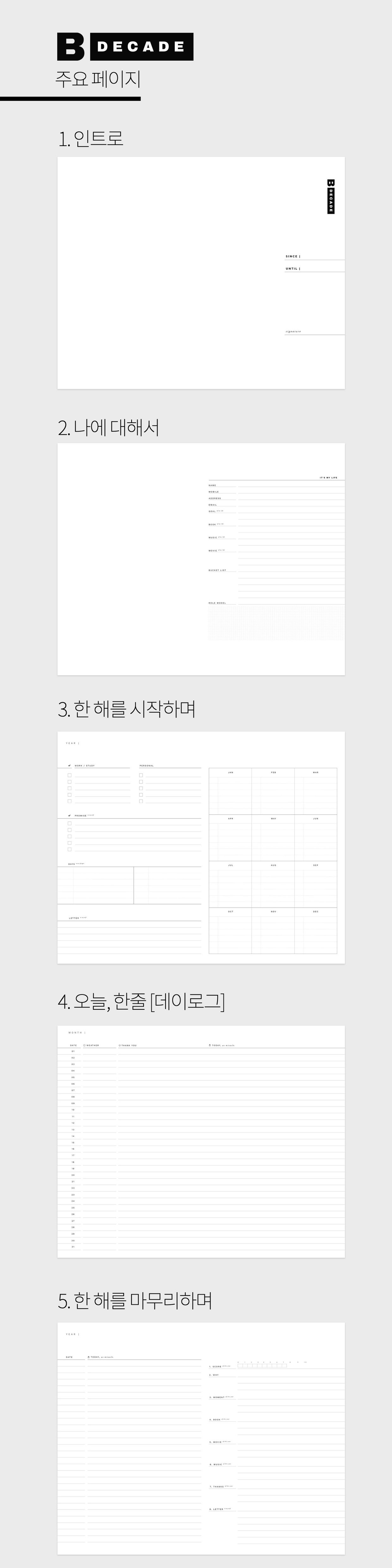 [블록 데케이드]는 단 하루를, 단 한 줄로, 여러분의 하루를 가볍게 수집하는 다이어리 입니다. 하지만 한달, 1년, 2년… 지날수록 여러분의 하루 하루가 수집되는 플래너 입니다.
