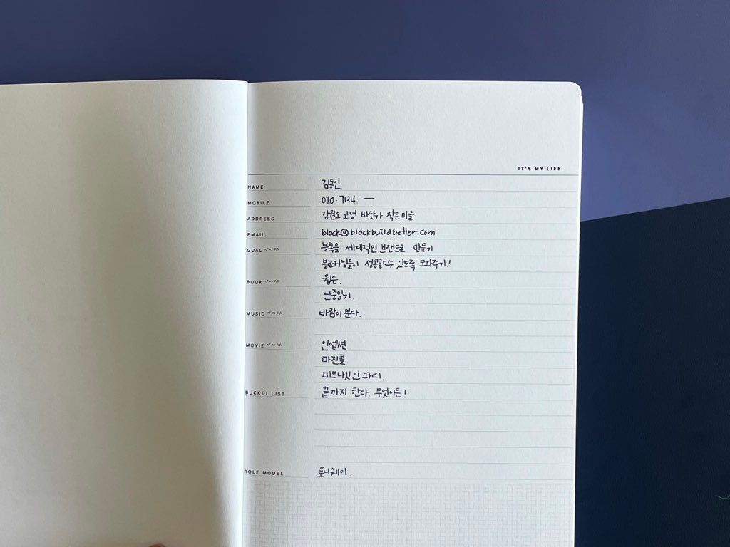 2. 블록의 꿈은 여러분 스스로가 진정한 자신의 강점을 발견하고, 그것에 집중해서, 자존감을 높이고, 자신만의 성공을 하는 것 입니다. 그리고 그 시작은 간단하게라도 ‘나에 대해서 생각해 보는 것’ 이라고 확신 합니다. 그래서 모든 블록 제품은 이런 나에 대해서 작성하는 페이지로 시작합니다.